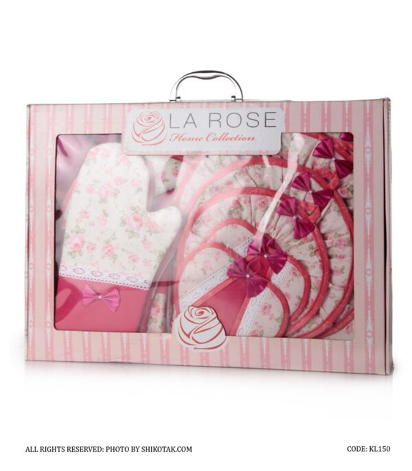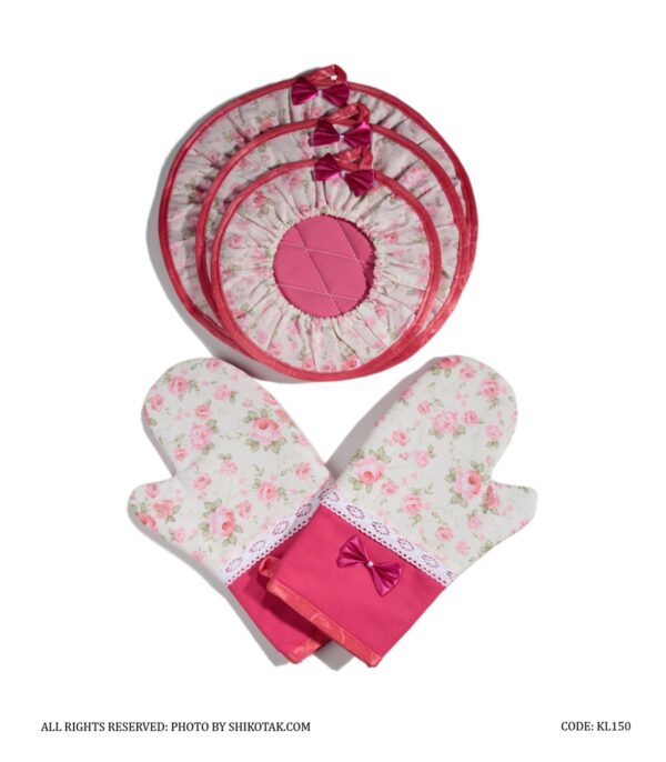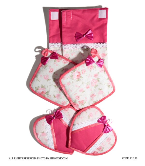 • محتویات بسته شامل: نمگیر ظرف-پیش بند-دمکنی کش داز-دستکش فر-دستگیره قلبی-دستگیره مربع-کیسه نان-جا نونی رومیزی-کیسه سبزی-جا سبزی رومیزی-حوله-دستگیره یخچال