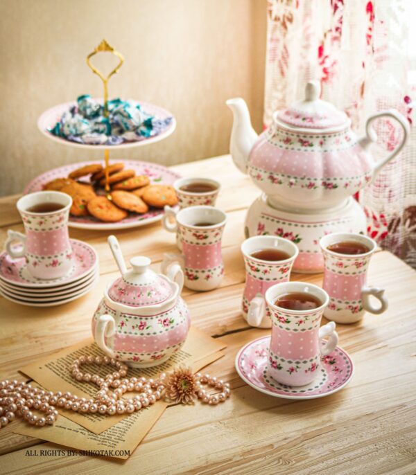 - شامل یک عدد قوری همراه پایه وارمر و شش عدد فجان کمرباریک و نعلبکی، یک عدد قندان با قاشق، یک عدد شیرین خوری دو طبقه